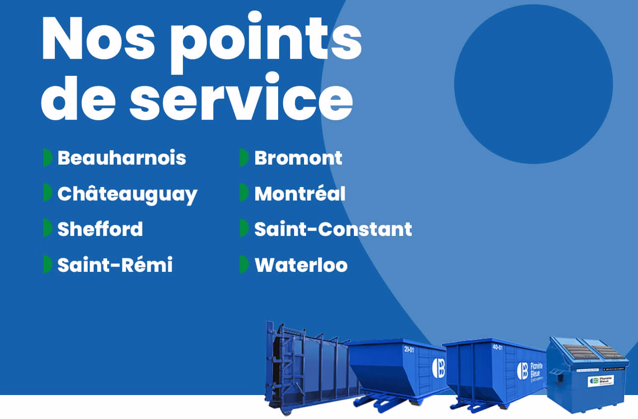 Nos points de service couvrent plusieurs régions pour mieux répondre à vos besoins en location de conteneurs et gestion des matières résiduelles.